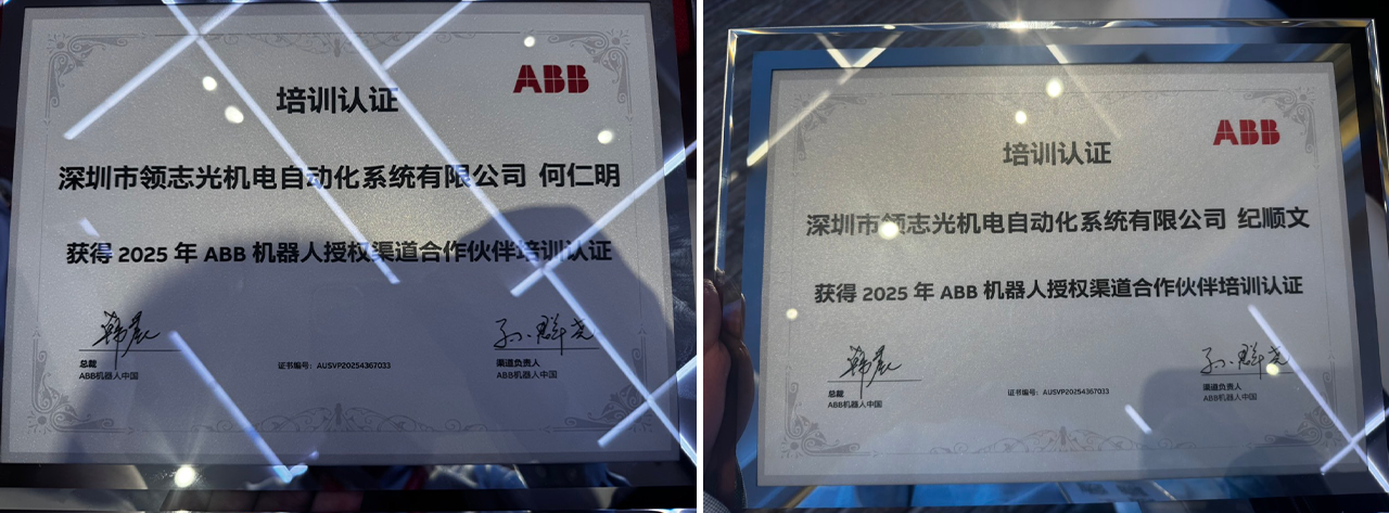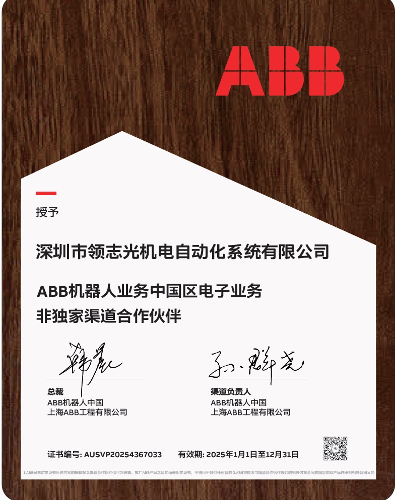 近日,深圳市领志光机电自动化系统有限公顺利通过 ABB 机器人中国区合作伙伴培训考核,正式斩获2025 年 ABB 机器人授权渠道合作伙伴培训认证。这一认证不仅是 ABB 对领志科技技术能力与服务水准的高度认可,更标志着领志科技在工业机器人领域的专业服务体系迈入全球化标准行列。
